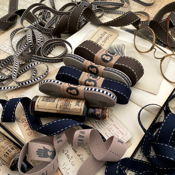Black Coffee, a Midnight blue and a sliver of skinny grey Rye. Tap into the moody vibes of these ribbons for your next project or event for a touch of dark romance.